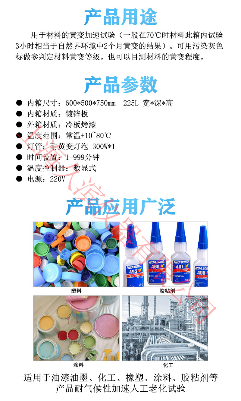 耐黃變照射試驗箱適用于陽光的紫外線輻照及熱度,試樣于機臺內(nèi)經(jīng)紫外線照射與溫度作用,經(jīng)過一段時間后,觀察試樣變的程度,可用染污灰色標作參考。