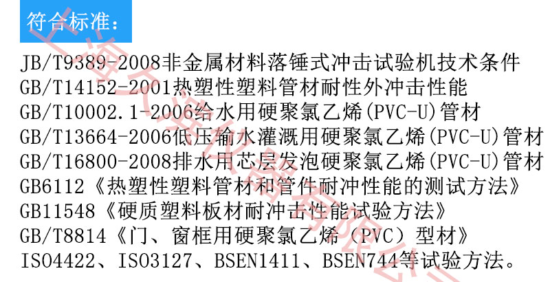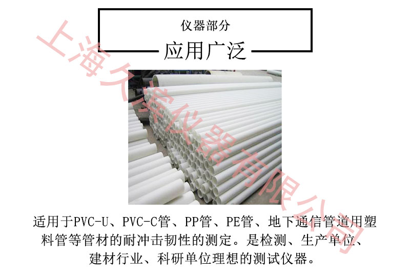 適用于PVC-U、PVC-C管、PP管、PE管、地下通信管道用塑料管等管材的耐沖擊韌性的測(cè)定。是檢測(cè)、生產(chǎn)單位、建材行業(yè)、科研單位理想的測(cè)試儀器。 符合行業(yè)標(biāo)準(zhǔn)JB/T9389落錘式?jīng)_擊試驗(yàn)機(jī)技術(shù)條件,滿足GB/T14152、GB/T10002.1、GB/T13664、GB/T16800、ISO4422、ISO3127、BSEN1411、BSEN744的試驗(yàn)方法。