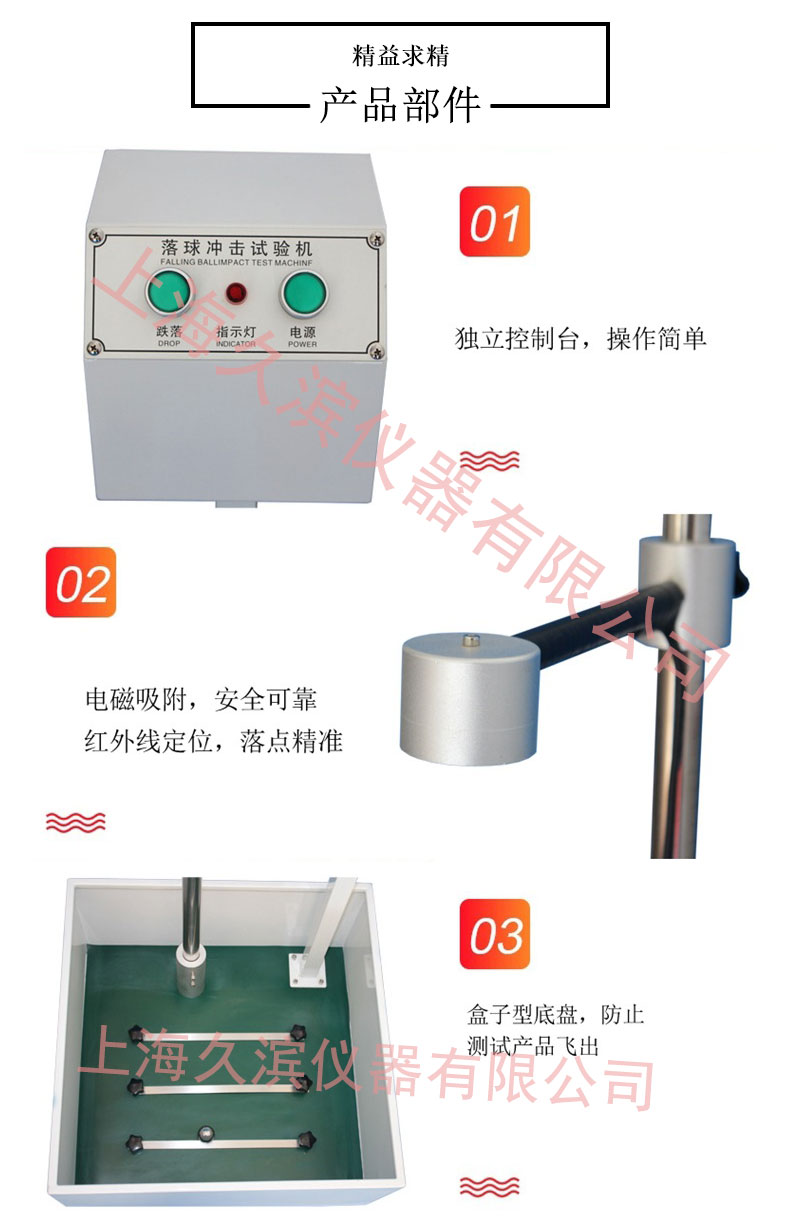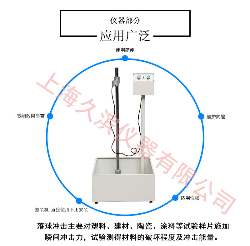 落球沖擊試驗機是一種用來檢測塑料、陶瓷、壓克力、玻璃織維等材料及涂料之堅固度。本設備符合JIS-K6745\A5430試驗標準。本機以規定一定重量之鋼球調整在一定的高度,使鋼球自由落下打擊試料,視其受損程度,以此來判斷試驗產品的質量。