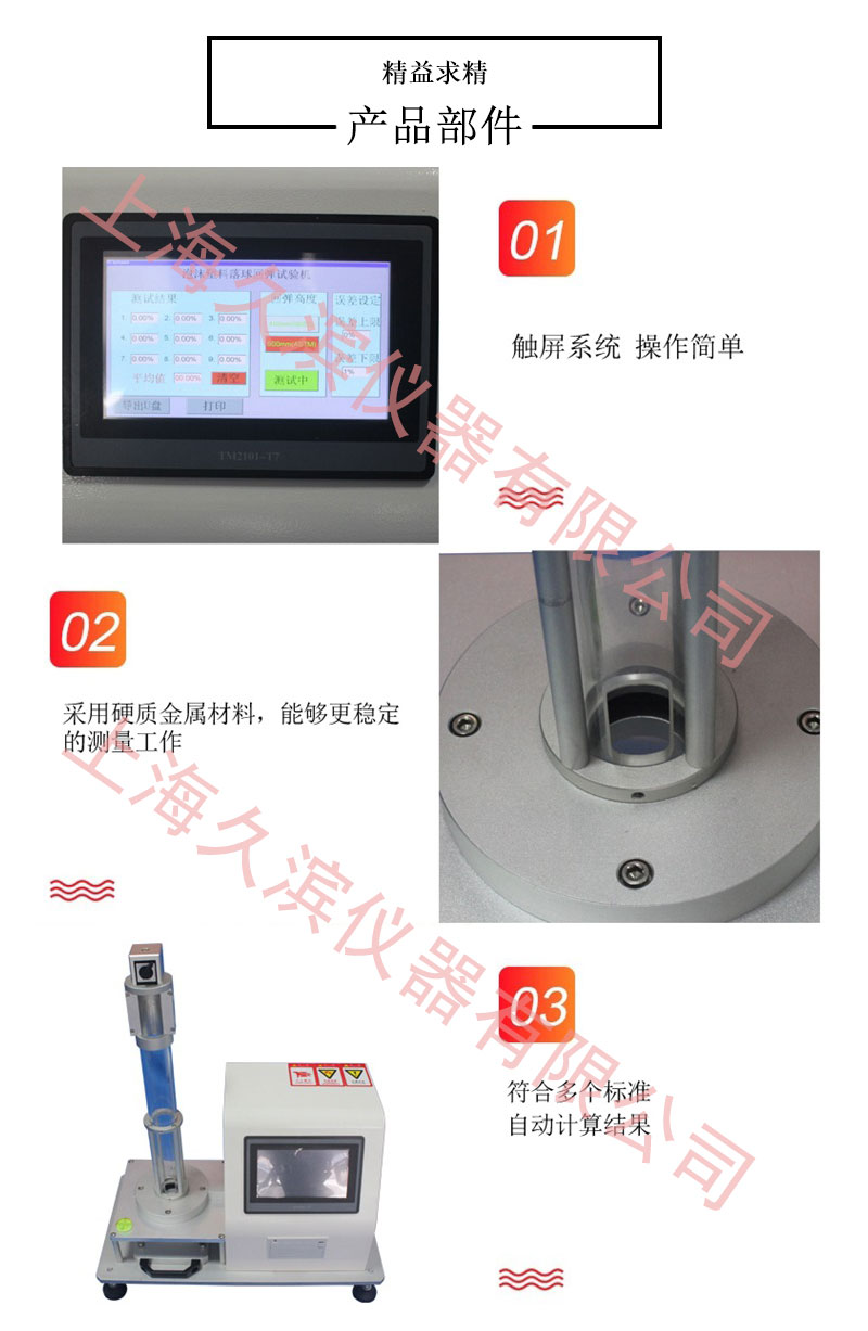專業(yè)測海綿,泡沫,橡膠等軟質材料而設計的一款高性價比的儀器,本機按照GB/T6670-2008設計制造,符合ASTM美標D3574及ISO8307測試標準.同時符合日本汽車座墊用氨基甲酸乙酯泡沫SES N3296的試驗方法.適用于測定軟質聚氨酯泡沫塑料的落球式回彈性能.本儀器通過給定直徑和質量的鋼球在規(guī)定高度上自由落在泡沫塑料試樣上,計算鋼球回彈的*大高度與鋼球落下高度比值的百分率既回彈率,以回彈率表示泡沫塑料的回彈性能。該機采用微處理器進行控制,液晶中文顯示,并可打印試驗數(shù)據(jù)。該機具有使用安全,可靠,測量精度高等特點。