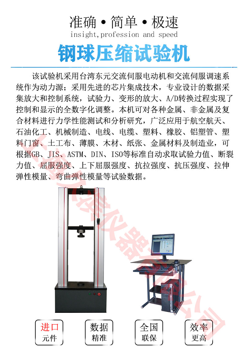 該試驗(yàn)機(jī)采用臺(tái)灣東元交流伺服電動(dòng)機(jī)和交流伺服調(diào)速系統(tǒng)作為動(dòng)力源;采用先進(jìn)的芯片集成技術(shù),專業(yè)設(shè)計(jì)的數(shù)據(jù)采集放大和控制系統(tǒng),試驗(yàn)力、變形的放大、A/D轉(zhuǎn)換過程實(shí)現(xiàn)了控制和顯示的全數(shù)字化調(diào)整。本機(jī)可對(duì)各種金屬、非金屬及復(fù)合材料進(jìn)行力學(xué)性能測(cè)試和分析研究,廣泛應(yīng)用航空航天、石油化工、機(jī)械制造、電線、電纜、塑料、橡膠、鋁塑管、塑料門窗、土工布、薄膜、木材、紙張、金屬材料及制造業(yè),可根據(jù)GB、JIS、ASTM、DIN、ISO等標(biāo)準(zhǔn)自動(dòng)求取試驗(yàn)力值、斷裂力值、屈服強(qiáng)度、上下屈服強(qiáng)度、抗拉強(qiáng)度、抗壓強(qiáng)度、拉伸彈性模量、彎曲彈性模量等試驗(yàn)數(shù)據(jù)。