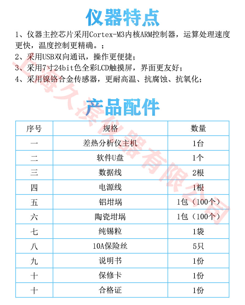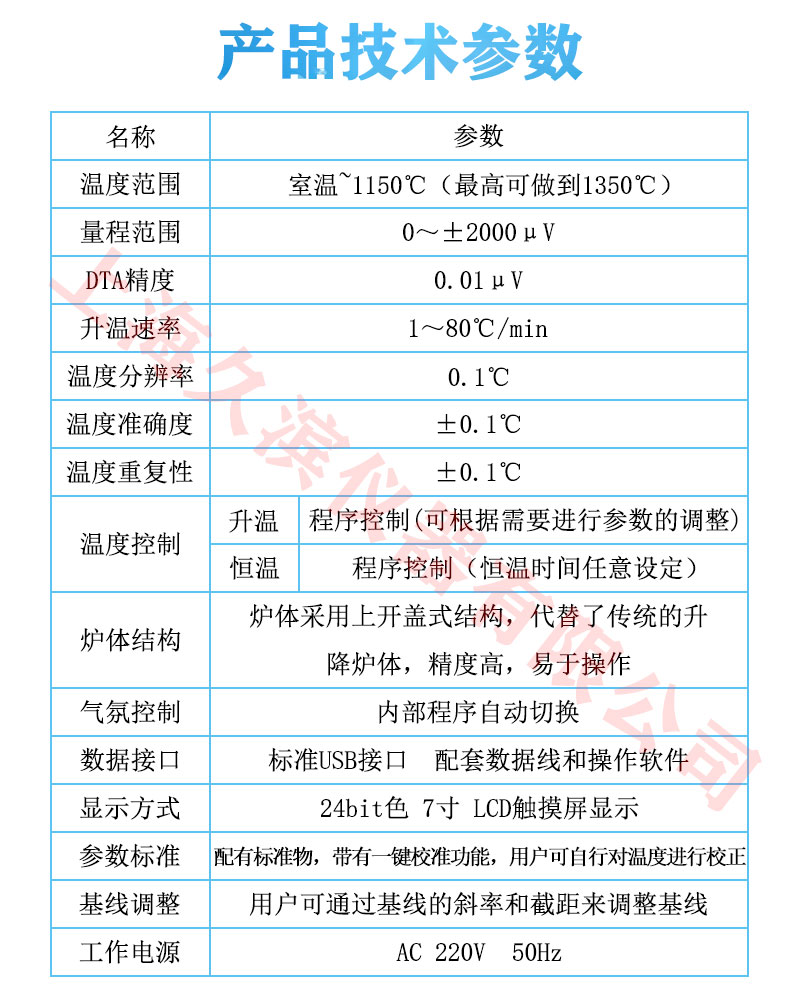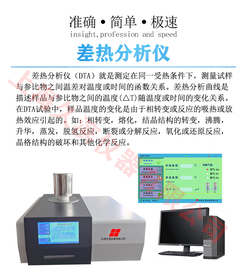 差熱分析是在程序控制溫度下,測量物質與參比物之間的溫度差與溫度關系的一種技術。差熱分析曲線是描述樣品與參比物之間的溫度(△T)隨溫度或時間的變化關系。在DTA試驗中,樣品溫度的變化是由于相轉變或反應的吸熱或放熱效應引起的。如:相轉變,熔化,結晶結構的轉變,沸騰,升華,蒸發,脫氫反應,斷裂或分解反應,氧化或還原反應,晶格結構的破壞和其他化學反應。