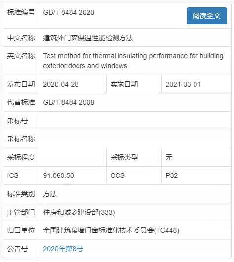 由中國建筑科學研究院有限公司修訂、全國建筑幕墻門窗標準化技術委員會歸口的國家標準GB/T 8484-2020《建筑外門窗保溫性能檢測方法》于2020年4月28日發布,2021年3月1日實施。
